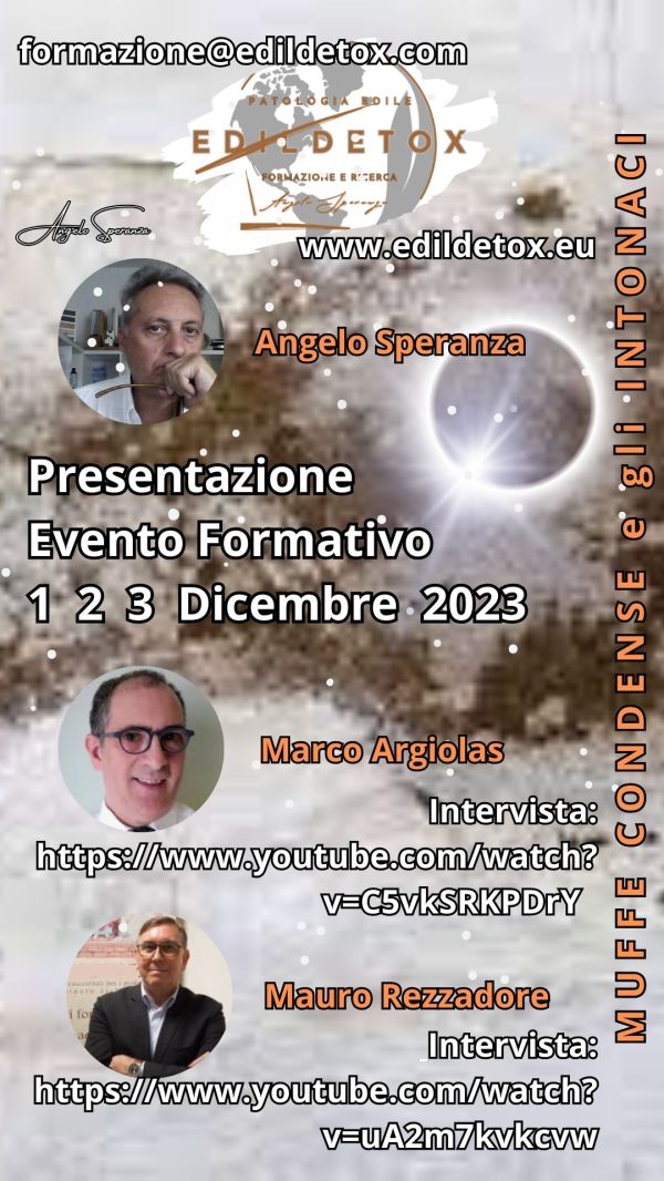Presentazione Evento Formativo di Approfondimento di II° Livello EDILDETOX. Che si terrà 1 2 3 Dicembre 2023 a Rimini. Gli argomenti che affronteremo sono le MUFFE e le CONDENSE e come interagiscono con l'INTONACO. N° 16 ore di lezione senza eguali di Alta Formazione Intervista al nostro Patologo Edile MARCO ARGIOLAS "MUFFE e CONDENSE" dalla... Continua a leggere →